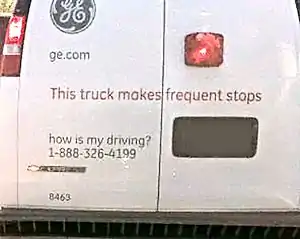 A "how's my driving" sign (or "how is my driving" or similar) is a decal posted or painted on a back of a fleet vehicle or other vehicle operated by an employee driver. The phone number, website address, and other identifying information are typically included on the sticker so that members of the public can call and report on the actions of the driver of the vehicle. Depending on the company, the phone number or website is monitored by the vehicle's owner or by a third-party company.[1]