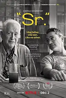 "Sr." is a 2022 American documentary film that examines the careers and relationship between Robert Downey Jr. and his father, Robert Downey Sr.[1][2][3] The film, directed by Chris Smith, was released theatrically on November 18, 2022, and was released on Netflix on December 2.[4]