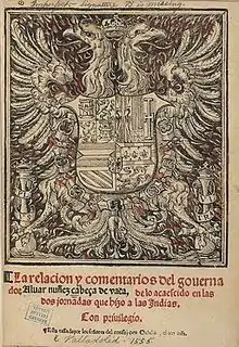 Álvar Núñez Cabeza de Vaca (Spanish pronunciation: [ˈalβaɾ ˈnuɲeθ kaˈβeθa ðe ˈβaka] ⓘ; c. 1488/90/92[1] – after 19 May 1559[2]) was a Spanish explorer of the New World, and one of four survivors of the 1527 Narváez expedition. During eight years of traveling across what is now the US Southwest, he became a trader and faith healer to various Native American tribes before reconnecting with Spanish civilization in Mexico in 1536. After returning to Spain in 1537, he wrote an account, first published in 1542 as La relación y comentarios ("The Account and Commentaries"[3]), which in later editions was retitled Naufragios y comentarios ("Shipwrecks and Commentaries"). Cabeza de Vaca is sometimes considered a proto-anthropologist for his detailed accounts of the many tribes of Native Americans that he encountered.[4]