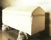In the Abbey of Las Huelgas, near Burgos, a cream-colored cap is on display, embroidered with reddish cauldrons. It dates from the early 13th century and has been almost perfectly preserved, after having lain for centuries hermetically sealed in the stone tomb of King Henry I of Castile (reigned 1214 – 1217). But the cap was not Henry's. It is rather thought that it belonged to Álvaro Núñez de Lara, and the cauldrons may well be the oldest representation of the heraldic arms of the family [...] The presence of the cap in the young king's tomb constitutes a graphic illustration of the political domination of the House of Lara in this period, and, in a certain sense, is also a symbol of the disaster which would befall them.[3][4]