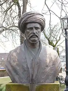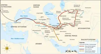 After spending about a year in the Payitaht, he published a German–Turkish dictionary in 1858. Later, he also published various other linguistic works. He also learned some twenty other Turkish languages and dialects. Returning to Budapest in 1861, he received a stipend of a thousand florins from the academy, and in the autumn of the same year, disguised as a Sunni dervish, and under the name of Reshit Efendi, he set out from the capital city of the Ottoman Empire. His route lay from Trebizond on the Black Sea to Tehran in Persia, where he joined a band of pilgrims returning from Mecca, spending several months with them traveling across Central Iran (Tabriz, Zanjan, and Kazvin). He then went to Shiraz, through Isfahan, and in June, 1863, he reached Khorezm (Central Asia). Throughout this time, he succeeded in maintaining his disguise as "Reshit Efendi," so that upon his arrival at the Khanate of Khiva he managed to keep up appearances during interviews with Khan Sayyid Muhammad. Together with his band of travelers, he then crossed Bokhara and arrived at Samarkand. He described the main monuments of Samarkand including the citadel of the city.[6] Initially, he aroused the suspicions of the local ruler, who kept him in an audience for a full half-hour. Vámbéry managed to maintain his pretences, and left the audience laden with gifts. Upon leaving Samarkand, Vámbéry began making his way back to Istambul, traveling by way of Herat. There he took leave of the band of dervishes and joined a caravan to Tehran, and from there, via Trebizond and Erzurum, to Istambul, arriving there in March 1864.[4]