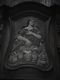 Woodcarving of St Mary Magdalene with chalice, waves, and skull