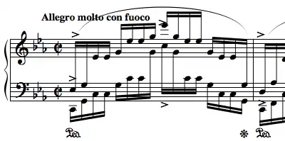 Étude Op. 25, No. 12 in C minor is the last of Frédéric Chopin's formal studies for the piano, opus 25, dedicated À Madame la Comtesse d'Agoult. It was first published in 1837 in French, German, and English. In the first French edition, the time signature is 4/4, but most recent editions of this piece follow the manuscript and German editions, which indicate cut time.[1] This work is a series of rising and falling arpeggios in various chord progressions from C minor. In addition, its opening bars recall the chord structure of the opening bars of the second prelude of the first book of The Well-Tempered Clavier by Johann Sebastian Bach.