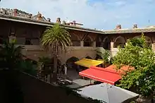 The large courtyard is surrounded by rooms behind arched stoa.[1] The corner rooms are reached by a diagonal passage.[4] There are 28 rooms on ground floor, which have a window next to their door under the stoa facing the courtyard. Entrance to the room is over a step. The fireplace in the room, situated in the wall separating the rooms, is flanked by two small closets.[4]