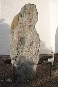The name Drengr is a bit unusual as it normally is a title associated with warriors or merchants.[1] However, there are several examples from Scandinavia in which an Old Norse word that is a designation of status has become a personal name.[4] In the inscription, each word in the runic text is separated with a punctuation mark consisting of two dots except for the name Drengr, which has been emphasized by using a different word divider consisting of a single dot.[5]