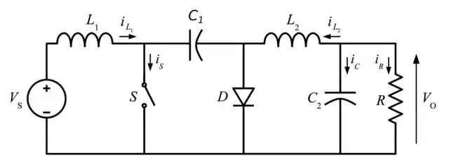 The Ćuk converter[1] (Serbo-Croatian: [tɕûːk], English: /ˈk/) is a type of buck-boost converter with low ripple current.[2] A Ćuk converter can be seen as a combination of boost converter and buck converter, having one switching device and a mutual capacitor, to couple the energy.