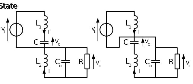 • in the on-state, inductor L1 is directly connected to the input source. Therefore . Inductor L2 is connected in series with C and the output capacitor, so