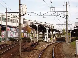 The station has an island platform and a side platform connected to the station building by a level crossing. The station building has both a staffed service counter and automatic ticket machines.