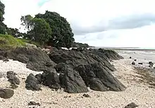 The layered sandstones and siltstones (mudstones) are seen in the cliff faces and also form the shore platform around the north and west sides of the park. These softer, generally yellow-brown rocks are approximately 19-20 million years old and are made up of the Waitamata formation (East Coast Bays facies) of early Miocene (Late Otaian) age.[7] Distortion and faulted dipping, of this once soft strata, can be seen both in the cliffs and in the small ridges of the rock platform extending out from the beach at low tide.
