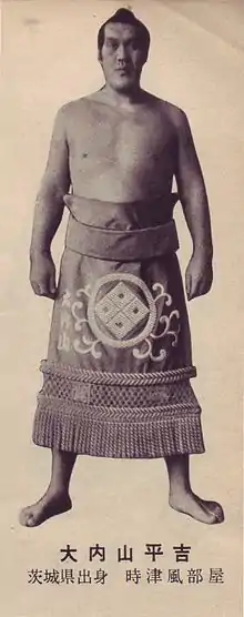 Ōuchiyama Heikichi (born Heikichi Ōuchi, 19 June 1926 – 1 November 1985) was a sumo wrestler from Hitachinaka, Ibaraki, Japan. He made his professional debut in 1944, and reached the top makuuchi division in 1949. He reached the second highest rank of ōzeki in 1955, and was a runner-up in two tournaments. He was well known for his extraordinary size – at 2.02 m (6 ft 7+1⁄2 in) tall he was the tallest modern era ōzeki until Akebono in 1992. After his retirement in 1959 he worked as a coach at Tokitsukaze stable and Tatsutagawa stable until his death in 1985.