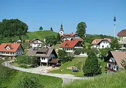 There are two churches in the settlement. The parish church is dedicated to Saint John the Evangelist. The date 1664 is carved into the church's door casing and its furnishings date from the first half of the 19th century.[4] The main altar dates from the end of the 18th century. It stands in the center of the village, south of Saint Josse's Church, and was declared a cultural monument in 2005.[16] A second church is dedicated to Saint Josse (Slovene: sveti Jošt).[17] It was first mentioned in written sources in 1401[18] and probably dates from the 13th century. One of the bells in the belfry was cast by the bell-maker Vivencius (active in the first half of the 14th century[19]) and is dated 1354.[4] The frescoes inside the church were produced by the Gorizia workshop between 1410 and 1420. The church was registered as a cultural monument in 2005.[18]
