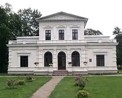 In 1880, Count Adam Alfred Broël-Plater built a graceful, small Empire-style palace next to the old Švėkšna Manor house, and named it after his wife - Genowefa (b. 1852) - 'Villa Genowefa'.[10] The building was also used for family celebrations and receptions.[3][4]