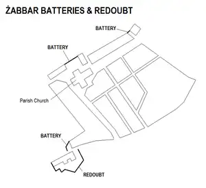 Żabbar was the closest Maltese city to the French-occupied harbour fortifications, and it was repeatedly bombarded from the Cottonera Lines. The inhabitants barricaded the streets and built batteries and a redoubt to protect the city from an attack. The fortifications of Żabbar consisted of: