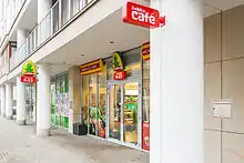 In addition to its regular manned stores, Żabka also has smaller, unmanned stores called Żabka Nano (formerly Żappka,[17] also the name of Żabka's mobile app, introduced in 2020). The first Żabka Nano store was opened at the grounds of the Poznań International Fair in June 2021. Notable Żabka Nano stores include one located inside Poland's largest Decathlon store in Piaseczno, opened in December 2021,[18] and a pilot store located at the Tesla Gigafactory Berlin-Brandenburg in Germany, which operated during the third quarter of 2022.[19]