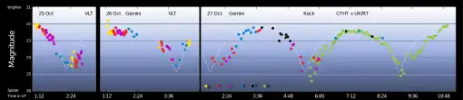 - ↑ Meech, Karen; et al. (20 November 2017). "Light curve of interstellar asteroid ʻOumuamua". ESO. European Southern Observatory. Archived from the original on 19 December 2019. Retrieved 21 November 2017.