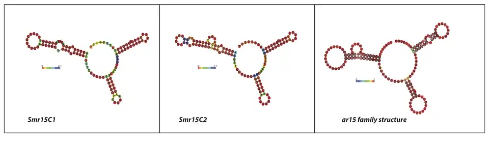 Figure 1: Consensus secondary structure of Smr15C1, Smr15C2 and the αr15 family predicted by RNA[7] and RNAalifold.[8] Smr15C1 and Smr15C2 are colored with a base probability scheme. The coloring of the αr15 family structure follows a base pairs conservation scheme: Red: base pair occurring in all sequences used to generate the consensus; yellow: two types of base pairing occur; Green: three types of base pairing occur. The shading of base pairs represents: Saturated, no inconsistent sequences; Pale, one inconsistent sequence; Very pale, two inconsistent sequences.