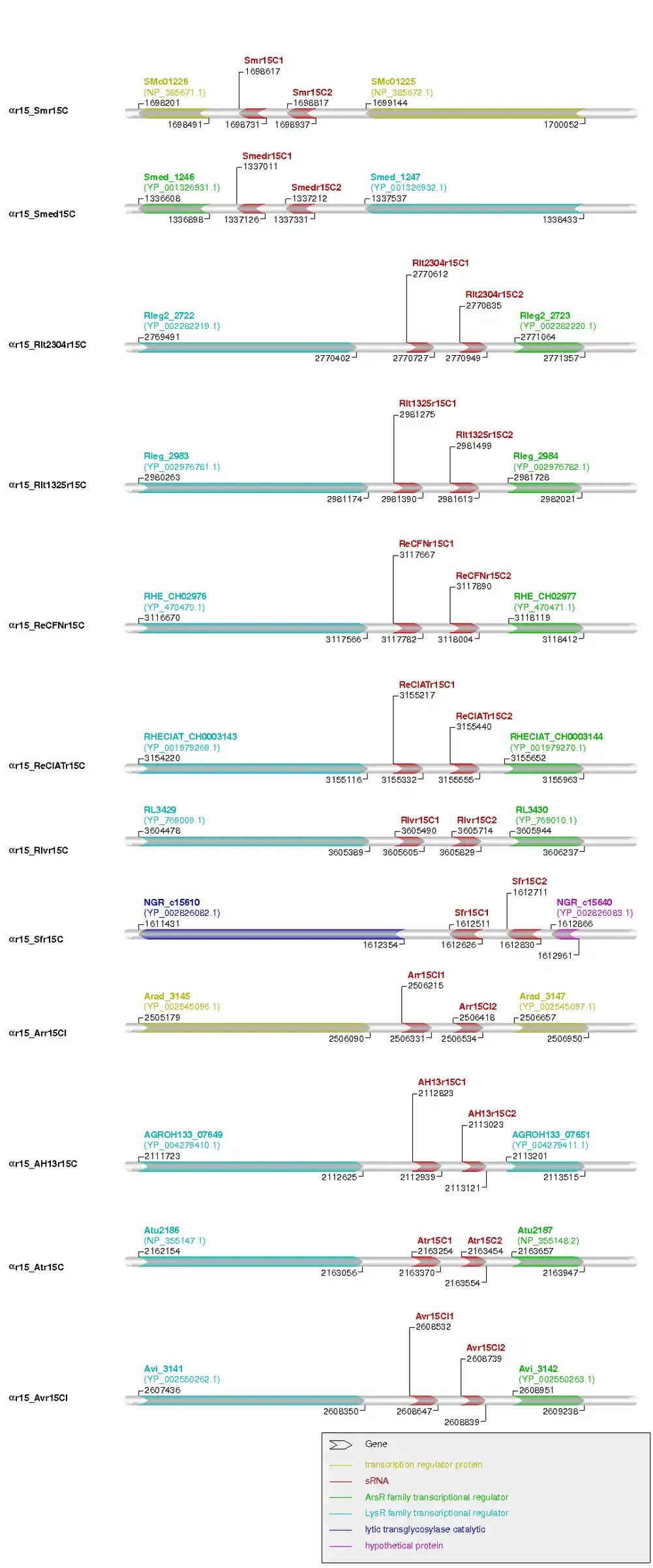 Figure 4: Genomic context scheme of Smr15 and its closest homologues in other organisms. The αr15 RNA genes are represented by red arrows and the flanking ORFs by arrows on different colors depending on their product function (legend). Numbers indicate the αr15 RNA gene's and flanking ORFs coordinates in each organism genome database. The gene strand is represented with the file direction. On the left of the figure identification names are used which correspond to a certain organism: Legend: αr15_Smr15C = Sinorhizobium meliloti 1021 (NC_003047), αr15_Smedr15C = Sinorhizobium medicae WSM419 chromosome (NC_009636), αr15_Sfr15C = Sinorhizobium fredii NGR234 chromosome (NC_012587), αr15_Atr15C = Agrobacterium tumefaciens str. C58 chromosome circular (NC_003062), αr15_AH13r15C = Agrobacterium sp. H13-3 chromosome (NC_015183), αr15_ReCIATr15C = Rhizobium etli CIAT 652 (NC_010994), αr15_Arr15CI = Agrobacterium radiobacter K84 chromosome 1 (NC_011985), αr15_Rlt2304r15C = Rhizobium leguminosarum bv. trifolii WSM2304 chromosome (NC_011369), αr15_Avr15C = Agrobacterium vitis S4 chromosome 1 (NC_011989), αr15_Rlvr15C = Rhizobium leguminosarum bv. viciae 3841 (NC_008380), αr15_Rlt1325r15C = Rhizobium leguminosarum bv. trifolii WSM1325 (NC_012850), αr15_ReCFNr15C = Rhizobium etli CFN 42 (NC_007761).