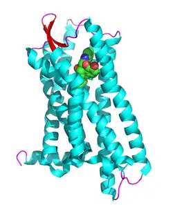 The δ-opioid receptor, also known as delta opioid receptor or simply delta receptor, abbreviated DOR or DOP, is an inhibitory 7-transmembrane G-protein coupled receptor coupled to the G protein Gi/G0 and has enkephalins as its endogenous ligands.[5] The regions of the brain where the δ-opioid receptor is largely expressed vary from species model to species model. In humans, the δ-opioid receptor is most heavily expressed in the basal ganglia and neocortical regions of the brain.[6]