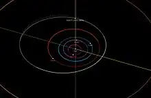 2010 UM26 and 2010 RN221 both orbit the Sun in the middle zone of the main asteroid belt. They share extremely similar elliptical orbits with semi-major axes of 2.58 astronomical units (386 million km, 240 million mi) and orbital periods of 4.14 years.[12]: 3 With orbital eccentricities of 0.326, the two asteroids come as close as 1.74 AU (260 million km; 162 million mi) from the Sun at perihelion to as far as 3.42 AU (512 million km; 318 million mi) at aphelion.[3][4] The asteroids' orbits are inclined 3.9° with respect to the plane of the Solar System.[12]: 3 The asteroids' mean anomalies, or angular positions along their orbits, differ by less than 0.01°.[3][4][12]: 3