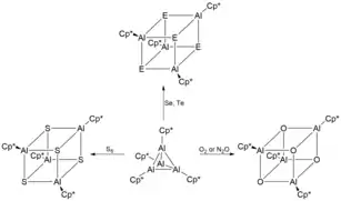 - ↑ Stelzer, Adrian C.; Hrobárik, Peter; Braun, Thomas; Kaupp, Martin; Braun-Cula, Beatrice (2016-04-29). "Completing the Heterocubane Family [Cp*AlE]4 (E = O, S, Se, and Te) by Selective Oxygenation and Sulfuration of [Cp*Al]4: Density Functional Theory Calculations of [Cp*AlE]4 and Reactivity of [Cp*AlO]4 toward Hydrolysis". Inorganic Chemistry. 55 (10): 4915–4923. doi:10.1021/acs.inorgchem.6b00462. ISSN 0020-1669. PMID 27129027.