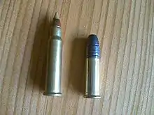 The .17 HMR round is similar to rounds developed by dedicated rimfire wildcatters who worked to create a rimfire cartridge with an exceptionally flat trajectory. These wildcatters were seeking to match the ballistics of the obsolete 5mm Remington Rimfire Magnum, which was made from 1970 to 1974, and was to that point the fastest rimfire cartridge ever produced.[5] With 5 mm diameter barrels and bullets being virtually unavailable at the time (the 5mm RMR was the last commercial 5 mm round until the 2004 release of the centerfire .204 Ruger), the commercially available .17 caliber became their bullet of choice. The .22 Winchester Magnum Rimfire was the logical parent case, rather than the 5mm RMR (with its unique case head size, which requires a significantly different bolt and magazine) because it was commonly available, and it is a far larger and stronger case than the next largest, the .22 Long Rifle. The .17 caliber wildcats not only met but far exceeded the 5mm RMR's velocities and flat trajectory. The accuracy of these cartridges was also quite good. However, the downrange energy of the 5mm RMR is superior to both .22 WMR and .17 HMR, so there is still potential in the 5 mm rimfire for wildcatters.[6]