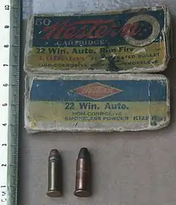![]() .22 Winchester Automatic Rimfire cartridge (copper case, right) with .22 Long cartridge (brass case, left) for comparison | ||||||||||||