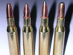 The cartridge was initially commercially loaded to drive a 130 grain (8.4 gram) bullet at approximately 960 m/s (3,140 ft/s), later reduced to 930 m/s (3,060 ft/s), demonstrating a high performance at the time of its introduction while being marketed as a suitable cartridge for big game shooting in the 270 to 460 metres (300 to 500 yd) range. Two additional bullet weights were soon introduced: a 100-grain (6.5 gram) hollow-point bullet for varmint shooting, and a 150 grain (9.7 gram) bullet, offering a higher sectional density, which made it suitable for achieving better penetration for large sized deer, such as wapiti, and moose.[3] However, the 130 grain bullet remains the most popular option.