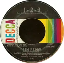 "1 - 2 - 3" is a 1965 song recorded by American blue-eyed soul singer Len Barry, who also co-wrote it with John Madara and David White (the latter two produced the recording). The recording's chorus and accompaniment were arranged by Jimmy Wisner. The single was released in 1965 on the American Decca label.[1][2] The writers were sued by Motown Records at the time, claiming that the song is a reworking of Holland-Dozier-Holland's "Ask Any Girl" released by The Supremes as the B-side to their single "Baby Love" the year before. They denied the claim, but after two years of litigation, agreed to give the Motown writers 15% of the song's writing and publishing royalties.[3] Holland-Dozier-Holland are listed as co-authors by BMI.[4]