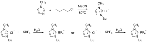 1-Methylimidazole alkylates to form dialkyl imidazolium salts. Depending on the alkylating agent and the counteranion, various ionic liquids result, e.g. 1-butyl-3-methylimidazolium hexafluorophosphate ("BMIMPF6"):[8][9]