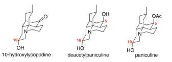 The 10-hydroxy Lycopodium alkaloids, which include 10-hydroxylycopodine, deacetylpaniculine, and paniculine, are a series of natural products isolated from a Chilean club moss Lycopodium confertum. Deacetylpaniculine and paniculine were also isolated from Lycopodium paniculatum.[1]