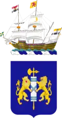 That for the regiments and separate battalions of the New York Army National Guard: On a wreath Argent and Azure, the full-rigged ship "Half Moon," all Proper. Motto: "Virtue Non Verbis" (By Valor, Not By Words).