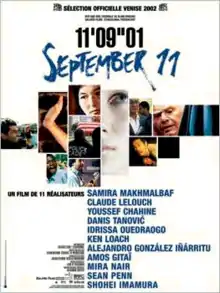 11'09"1 September 11 is a 2002 international film composed of 11 contributions from different filmmakers, each from a different country. Each gave their own vision of the events in New York City during the September 11 attacks, in a short film of 11 minutes, 9 seconds, and one frame. The original concept and production of the film was by French producer Alain Brigand. It has been released internationally with several different titles, depending on the language. It is listed in the Internet Movie Database as 11'09"01 - September 11, while in French, it is known as 11 minutes 9 secondes 1 image and in Persian as 11-e-Septambr.