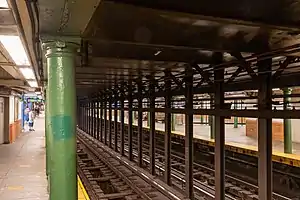 As with other stations built as part of the original IRT, the station was constructed using a cut-and-cover method.[6]: 237 The tunnel is covered by a "U"-shaped trough that contains utility pipes and wires. The bottom of this trough contains a foundation of concrete no less than 4 inches (100 mm) thick.[30]: 9 The platforms consist of 3-inch-thick (7.6 cm) concrete slabs, beneath which are drainage basins. The original platforms contain circular, cast-iron Doric-style columns spaced every 15 feet (4.6 m), while the platform extensions contain I-beam columns. Additional columns between the tracks, spaced every 5 feet (1.5 m), support the jack-arched concrete station roofs.[4]: 4 [30]: 9 There is a 1-inch (25 mm) gap between the trough wall and the platform walls, which are made of 4-inch (100 mm)-thick brick covered over by a tiled finish.[30]: 9