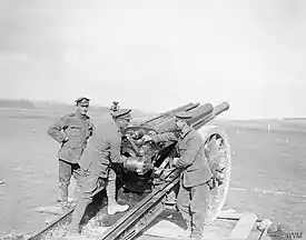 Meanwhile the battery registered its guns on enemy batteries and on Douvrin, and received a few German shells in return. This counter-battery (CB) fire, sometimes in conjunction with observation aircraft, became the battery's routine. German return fire included both high explosive and gas shells. On 27 April the gun positions round Anneqin were heavily shelled and later enveloped in a gas cloud released from near Loos (part of the action known as the Gas attacks at Hulluch). The battery replied with a vigorous bombardment while the gunners were wearing their gas helmets. The battery positions were shelled again on 29 April, suffering some damage.[10][14][15]
