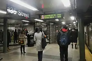 The city government took over the IRT's operations on June 12, 1940.[15][16] The IRT routes were given numbered designations with the introduction of "R-type" rolling stock. These fleet contained rollsigns with numbered designations for each service. The first such fleet, the R12, was put into service in 1948.[17] The route to White Plains Road, formerly the route to West Farms, became known as the 2, while the route to Lenox Avenue–145th Street became the 3.[18] The New York City Transit Authority (NYCTA) announced plans in 1956 to add fluorescent lights above the edges of the station's platforms.[19] In 1959, all 2 and 3 trains became express.[20]