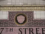 The decorative scheme consists of silver and blue tile tablets (which may not have been original to the station design); white tile bands; a buff terracotta cornice; and green terracotta plaques.[50]: 40 The mosaic tiles at all original IRT stations were manufactured by the American Encaustic Tile Company, which subcontracted the installations at each station.[50]: 31 The decorative work was performed by tile contractor Manhattan Glass Tile Company and terracotta contractor Atlantic Terra Cotta Company.[50]: 40 The mosaics are in pink and black. The ceramic cartouche is also in pink and shows a three-faced figure. The three faces represent "Respice", "Adspice", and "Prospice", and are an emblem of the nearby City College.