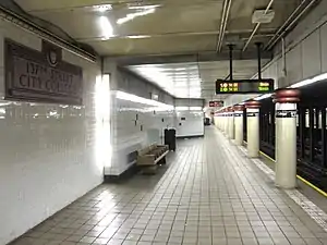 The city government took over the IRT's operations on June 12, 1940.[20][21] Platforms at IRT Broadway–Seventh Avenue Line stations between 103rd Street and 238th Street, including those at 137th Street, were lengthened to 514 feet (157 m) between 1946 and 1948, allowing full ten-car express trains to stop at these stations.[19] A contract for the platform extensions at 137th Street and eight other stations on the line was awarded to Spencer, White & Prentis Inc. in October 1946,[22] with an estimated cost of $3.891 million.[23] The platform extensions at these stations were opened in stages. On April 6, 1948, the platform extension at 137th Street opened.[19][24] Simultaneously, the IRT routes were given numbered designations with the introduction of "R-type" rolling stock, which contained rollsigns with numbered designations for each service.[25] The route to 242nd Street became known as the 1.[26] In 1959, all 1 trains became local.[27]