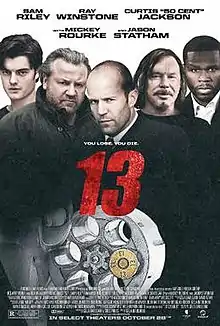 13 is a 2011 American psychological crime thriller film directed by Géla Babluani (who also directed the original), stars Sam Riley, Ray Winstone, 50 Cent, Mickey Rourke and Jason Statham. It is a remake of the 2005 Georgian-French film 13 Tzameti.