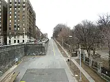The "high" portion of 155th Street starts on the West Side at Riverside Drive, crossing Broadway, Amsterdam Avenue, and St. Nicholas Avenue. At St. Nicholas Place, the terrain drops off steeply, forming Coogan's Bluff. 155th Street is carried on the 1,600-foot (490 m) long 155th Street Viaduct, a City Landmark constructed in 1893, that slopes down towards the Harlem River, continuing onto the Macombs Dam Bridge, crossing over (but not intersecting with) the Harlem River Drive.[2] A separate, unconnected section of 155th Street runs under the viaduct, connecting Bradhurst Avenue and Harlem River Drive.