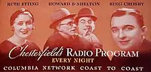 Sponsored by Chesterfield Cigarettes, the show was re-launched in January 1933 and broadcast each night (except Sundays) from WABC New York, at 9–9:15 pm EST with Crosby appearing on Wednesdays and Saturdays. On other nights, Ruth Etting (Mondays and Thursdays) and Tom Howard and George Shelton (Tuesdays and Fridays) were featured. Jane Froman replaced Howard and Shelton on February 21.[16] The show came from New York with Norman Brokenshire again acting as announcer and Lennie Hayton conducting the orchestra. Eddie Lang accompanied Crosby, who used "Just an Echo" as his closing theme song. Crosby's contract paid him $2000 a week for 13 weeks[17] and he made his bow on January 4. Variety liked it saying, "… As far as this quarter hour is concerned, it is highly palatable stuff, if not particularly distinguished. Crosby and Hayton are both adept but the presentation is quite formula featuring Crosby in three and a half songs not counting the 'Please' vamp-in."[18]