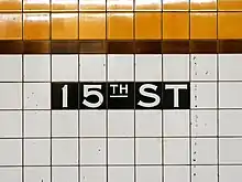 Both trackside walls have an orange-yellow trim line with a medium red-brown border with small black and white "15TH ST" tile captions below it at regular intervals. The tile band is set in a three-high course, a pattern usually reserved for express stations.[3]:4 The tiles were part of a color-coded tile system used throughout the IND.[22] The tile colors were designed to facilitate navigation for travelers going away from Lower Manhattan. As such, the yellow tiles used at 15th Street were also used at Seventh Avenue, the next express station to the north, while a different tile color is used at Church Avenue, the next express station to the south. Yellow tiles are also used at Fort Hamilton Parkway, the only other local station between Seventh Avenue and Church Avenue.[23][24]