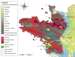 The collision between the Aquitaine and Armorican tectonic plates gave birth in the Carboniferous period to the Hercynian basement of the Armorican massif creating faults oriented north-west, south-east, which go from the Pointe du Raz to Nantes and the Landes de Lanvaux to Angers and extend south of the Loire estuary. These shear fractures are at the origin of grabens which are accentuated during the Mesozoic and the Cenozoic, and fill up with sediments that may be more than 100 m thick in the deepest ditches. They are still active in the Quaternary and their replay explains the earthquakes of the south of the Loire and more particularly those of the Vendée.[10][11]