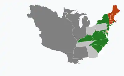 | 1804 presidential election results. Green denotes states won by Jefferson, burnt orange denotes states won by Pinckney. Numbers indicate the number of electoral votes allotted to each state. | |
