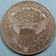 The Coinage Act of 1792, the legislation which provided for the establishment of the Mint of the United States (today the United States Mint), authorized coinage of multiple denominations of gold, silver and copper coins.[4] According to the act, the dollar, or "unit", was to "be of the value of a Spanish milled dollar as the same is now current, and to contain three hundred and seventy-one grains and four sixteenth parts of a grain of pure, or four hundred and sixteen grains of standard silver".[4] The act went on to state that the coin would be struck in an alloy consisting of 89.2 percent silver and 10.8 percent copper.[5] The purity and weight standards outlined in the Act were based on the mean of several assays conducted on Spanish milled dollars.[6] However, the dollars were mandated by Spanish law to contain 90.2 percent silver, and most of the unworn examples in circulation in the United States at the time contained approximately 1.75 grains (0.113 g) more than the silver dollars authorized by the Act.[7] In 1793, President George Washington signed into law a bill which declared Spanish milled dollars legal tender, provided that they weighed no less than 415 grains (26.9 g), which meant that at the lowest weight allowed by law, the Spanish dollars would contain approximately 0.5 percent less silver than the United States dollar coins.[8][9] As a result, the United States silver dollars and unworn Spanish dollars were largely forced out of circulation in accordance with Gresham's law; the lighter Spanish dollars were shipped in quantity for circulation in the United States, while the heavier pieces would be turned in to the Philadelphia Mint to be recoined into United States coinage to take advantage of the discrepancy in weight.[9] At that time, silver bullion was supplied to the Mint exclusively by private depositors, who, according to the Coinage Act of 1792, had the right to have their bullion coined free of charge.[10][5] As large silver coins were a preferred method of commerce throughout the world, especially China, a considerable number of the United States dollars requested by silver depositors were exported to satisfy that demand.[9]