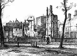 Further destruction was inflicted upon houses, warehouses, tollhouses and civic buildings, particularly on Queen Square, Prince's Street and King Street.[21] There was an attempt to attack the Bristol Corporation's dock company and the dock gates were burnt.[14][17][22] Fires set at the Bishop's Palace, customs house, excise office and at other buildings were reportedly visible from Newport, Wales.[17][21] Chants from the crowd included "Oh! It's only Corporation property!" to justify the destruction of civic buildings and "Down with the churches and mend the roads with them".[22] It is known that a number of "fireballs" of flammable tow and pitch were manufactured for use by rioters; though otherwise they were armed only with improvised sticks, railings, and tools looted from blacksmiths.[14][22]