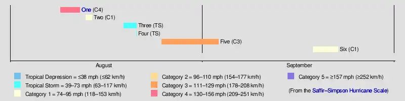 The 1856 Atlantic hurricane season featured six tropical cyclones, five of which made landfall. The first system, Hurricane One, was first observed in the Gulf of Mexico on August 9. The final storm, Hurricane Six, was last observed on September 22. These dates fall within the period with the most tropical cyclone activity in the Atlantic. Only two tropical cyclones during the season existed simultaneously. One of the cyclones has only a single known point in its track due to a sparsity of data. Operationally, another tropical cyclone was believed to have existed in the Wilmington, North Carolina area in September,[1] but HURDAT – the official Atlantic hurricane database – excludes this system. Another tropical cyclone that existed over the Northeastern United States in mid-August was later added to HURDAT.[2]