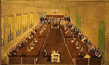 Wallachia's ad hoc Divan opened on September 29 (October 10), seven days after its Moldavian counterpart. The rainy weather did not chase away the crowd gathering in a show of support on Dealul Mitropoliei, Bucharest.[158] The celebration lasted into the night, with Bucharest festively lit with the newly introduced gas lighting and adorned with the National Party's slogans.[159] The Divan's first session saw enthusiastic speeches, including one by Rosetti which ended with shouts of Trăiască România! ("Long Live Romania!").[137] It subsequently organized itself: two committees were set up to validate the deputies and come up a parliamentary procedure; one was chaired by Grigore Gr. Ghica.[59] Metropolitan Neofit was, ex officio, the Divan's president, and tacitly endorsed the union,[152] with N. Golescu elected vice president by a large margin.[160] The Divan's secretaries included D. Brătianu (elected with 85 votes),[139] C. A. Crețulescu, Rosetti, Turnavitu,[161] Ștefan Golescu, and Bosianu.[162] Iancu Ionașcu oversaw the official printing office.[163]