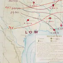 ![]() Weather Bureau surface weather analysis of the hurricane after moving inland over Texas on September 17, 1875 | |