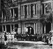 The political fallout of the queen's actions led to citywide political rallies and meetings in Honolulu. Anti-monarchists, annexationists, and leading Reformist politicians, including legislators Lorrin A. Thurston, William Owen Smith, and William Chauncey Wilder, formed the Committee of Safety in protest of the "revolutionary" action of the queen and conspired to depose her. In response, royalists and loyalists formed the Committee of Law and Order and met at the palace square on January 16. White, Nāwahī, Bush, Wilcox, and Antone Rosa and other pro-monarchist leaders gave speeches in support for the queen and the government.[26] These actions and the radicalized political climate eventually led to the overthrow of the monarchy, on January 17, 1893, by the Committee of Safety, with the covert support of United States Minister John L. Stevens and the landing of American forces from the USS Boston. After a brief transition under the Provisional Government, the oligarchical Republic of Hawaii was established on July 4, 1894, with Sanford B. Dole as president.[27][28] During this period, the de facto government was composed largely of residents of American and European ancestry, although a few Native Hawaiians from the 1892 legislature: John Ena, John Kauhane, and Jose Kekahuna Iosepa signed the constitutional convention for the Republic while Kauhane and George Panila Kamauoha would serve multiple terms in the legislature of the Republic.[29]