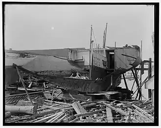 Throughout Cape Cod and the Islands, trees, fences, and utility wires were blown down. Apple and pear trees were stripped of their fruit, and vegetable crops suffered. Floodwaters inundated streets and cellars while the driving rain forced its way inside east-facing walls.[21][22] Many roads were littered with the broken branches of large trees; some smaller trees and shrubs were uprooted entirely.[23] Part of the Nantucket Railroad was washed out at Tom Nevers Head, and wharves on the island received minor damage.[24] In the mid-morning on August 21, the Portland, Maine-based fishing schooner Mary Lizzie sank in heavy seas off Nantucket. Six of the seven crew members drowned. The one survivor held to floating debris for 33 hours until he was rescued by a passing steamship.[25][26] The racing yacht Volunteer, winner of the 1887 America's Cup, broke free from her anchorage and was tossed onto the rocks near the entrance to Hadley's Harbor on Naushon Island, Massachusetts. Pounding seas battered the vessel, breaking up much of its deck and flooding the hull. After an unsuccessful attempt by another yacht to rescue Volunteer with the storm still raging, a tugboat was able to dislodge the stricken craft and tow her to a nearby wharf.[21][23] The storm disabled several ships around Martha's Vineyard, including the schooners Sarah Louise and Clara Jane, both of which were damaged, and the sloop Cassie, left stranded on the shore. Numerous other fishing vessels lost their anchors, sails, or seine fishing boats. The maritime havoc extended westward to New Jersey's Sandy Hook, where a yacht was wrecked.[22]